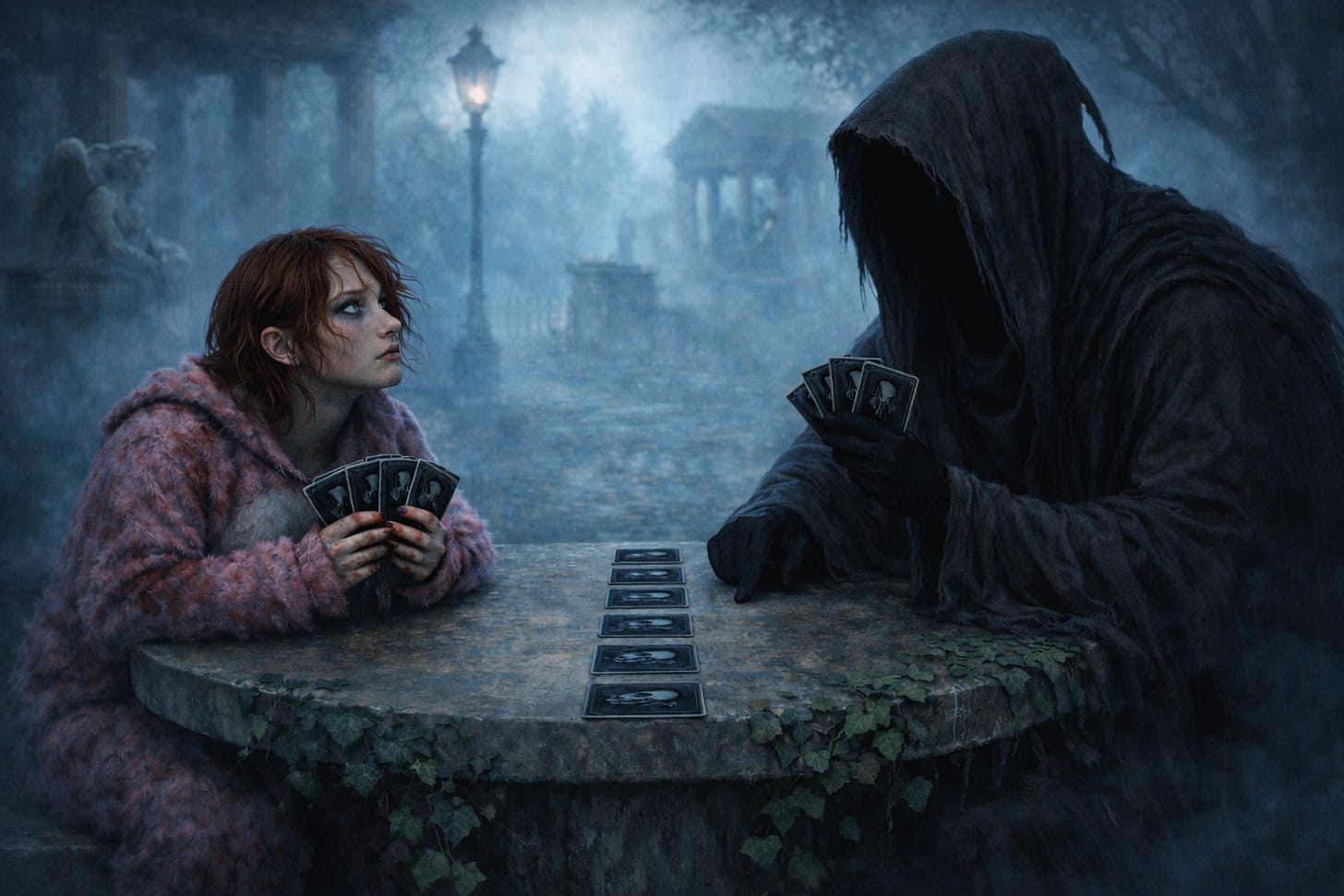 “My plans?” she scoffed. “Oh, you know, go get my master’s, max out my 401k, put a downpayment on a little place in the suburbs – I’m going to keep gambling until I get in so deep that I have to suck some other psychopomp’s cock to dig myself back out again!”